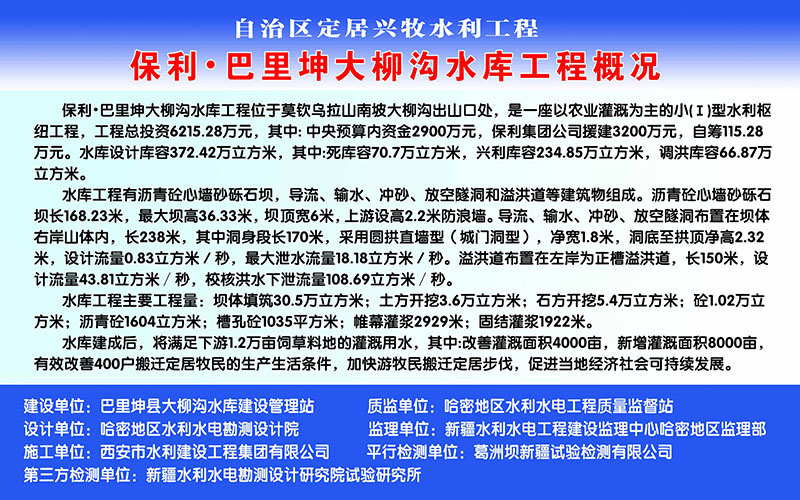 大柳溝水庫位于新疆維吾爾自治區(qū)巴里坤縣莫欽烏拉山南坡,距哈密市154km。地理位置東經(jīng)93°35.5'-38',北緯43°35'-37'。水庫距巴里坤縣54.0km,有鄉(xiāng)村公路相通,交通比較便利。工程屬攔河式水庫。承擔下游灌溉、人畜用水的任務(wù),同時兼防洪功能,水庫控制灌溉面積1.2萬畝。水庫總庫容372.42萬m3,最大壩高36.33m,壩頂長168.23m。樞紐工程由攔河壩,導流放水洞,溢洪道等建筑物組成。工程規(guī)模屬?。?)型。