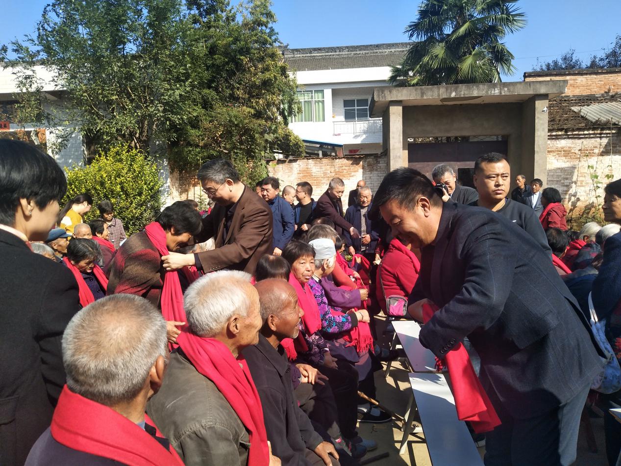 接下來,市水務(wù)局副局長(zhǎng)劉博和公司董事長(zhǎng)王長(zhǎng)隨為村里的老人們佩戴紅圍巾。暖暖的紅圍巾,滿滿的民生情。戴著滿載孝意的紅圍巾,老人們臉上洋溢著笑容,倍感溫馨。